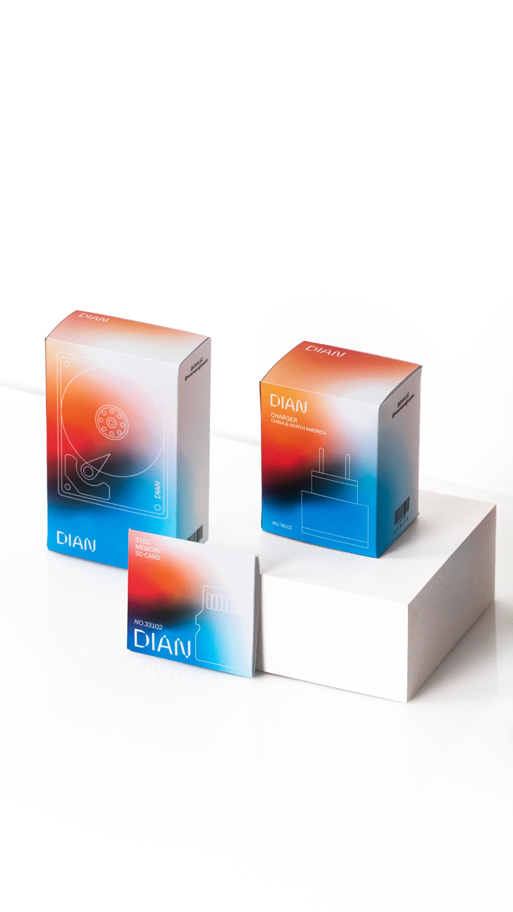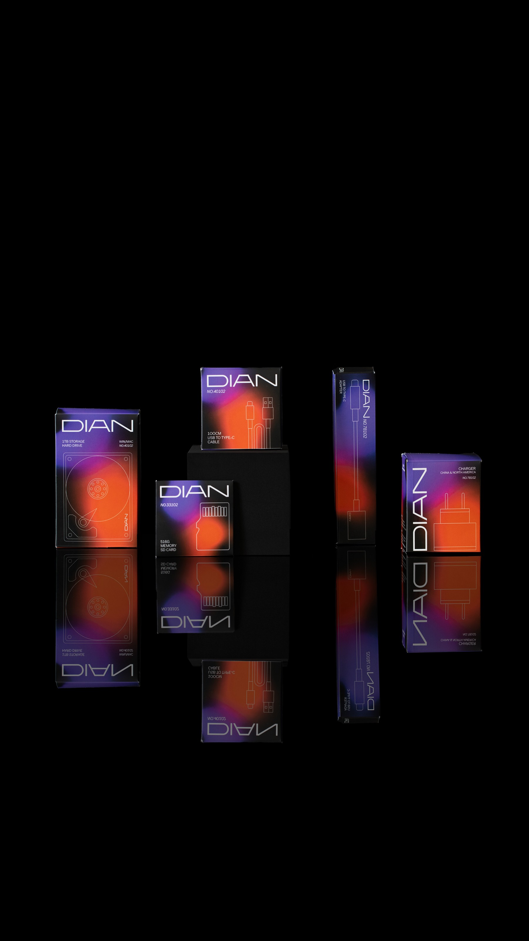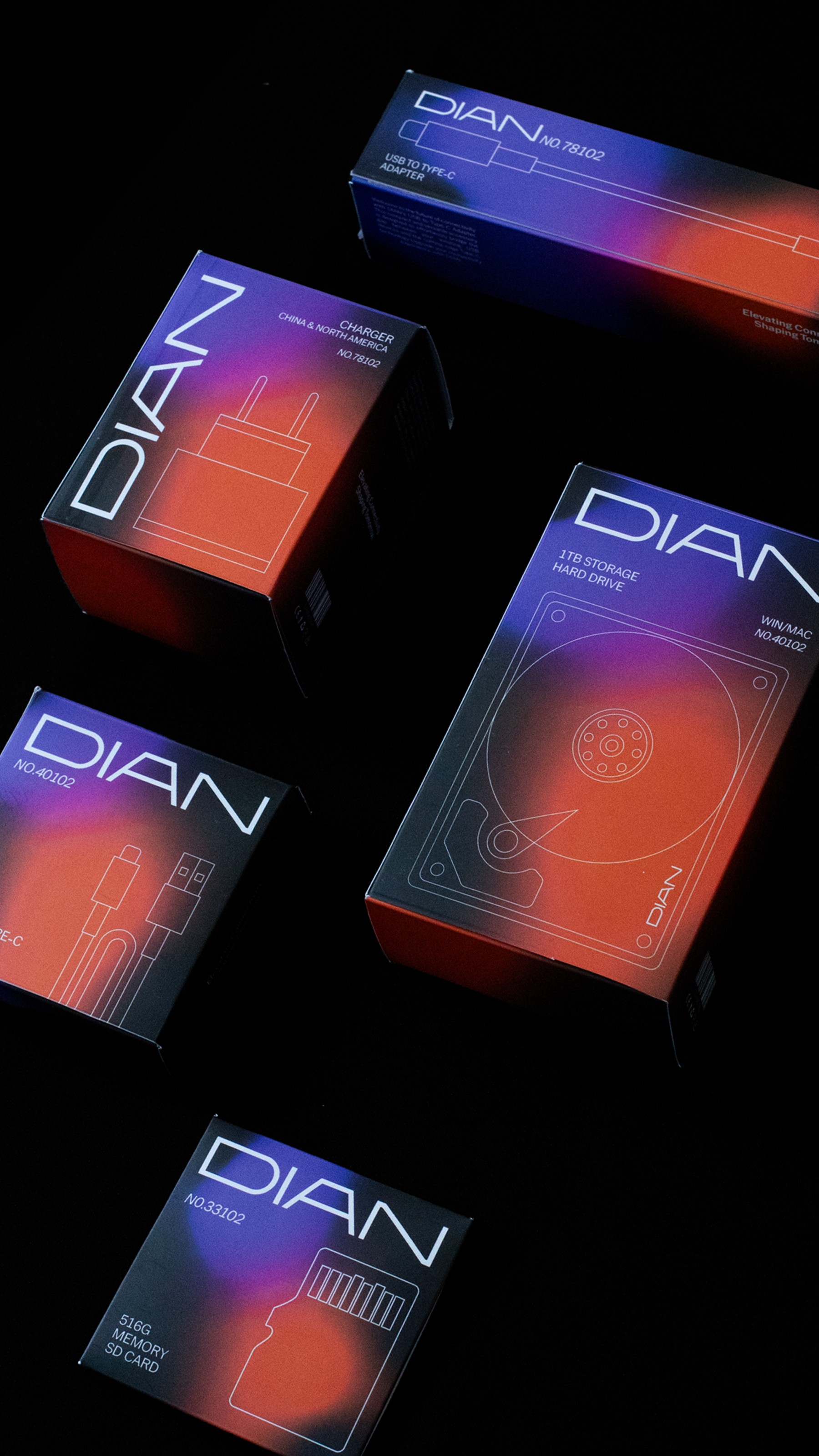 DIAN, a Shenzhen-based electronics accessory brand, aimed to capture the attention of the U.S. market. Panglossian Studio developed a bespoke packaging system, dominated by black tones and accented with purple-to-orange gradients, inspired by the vibrant night lights of New York’s Fifth Avenue.