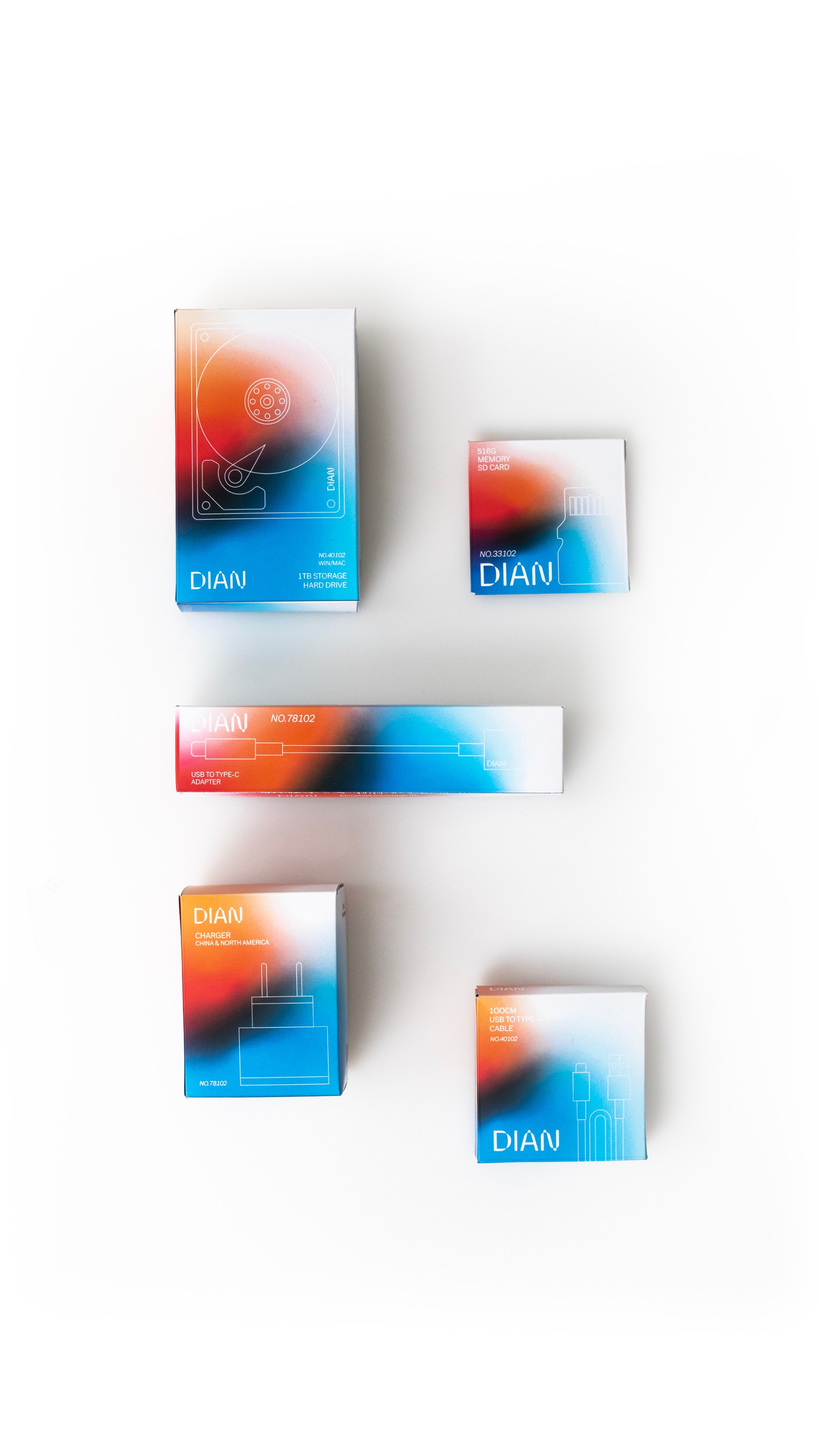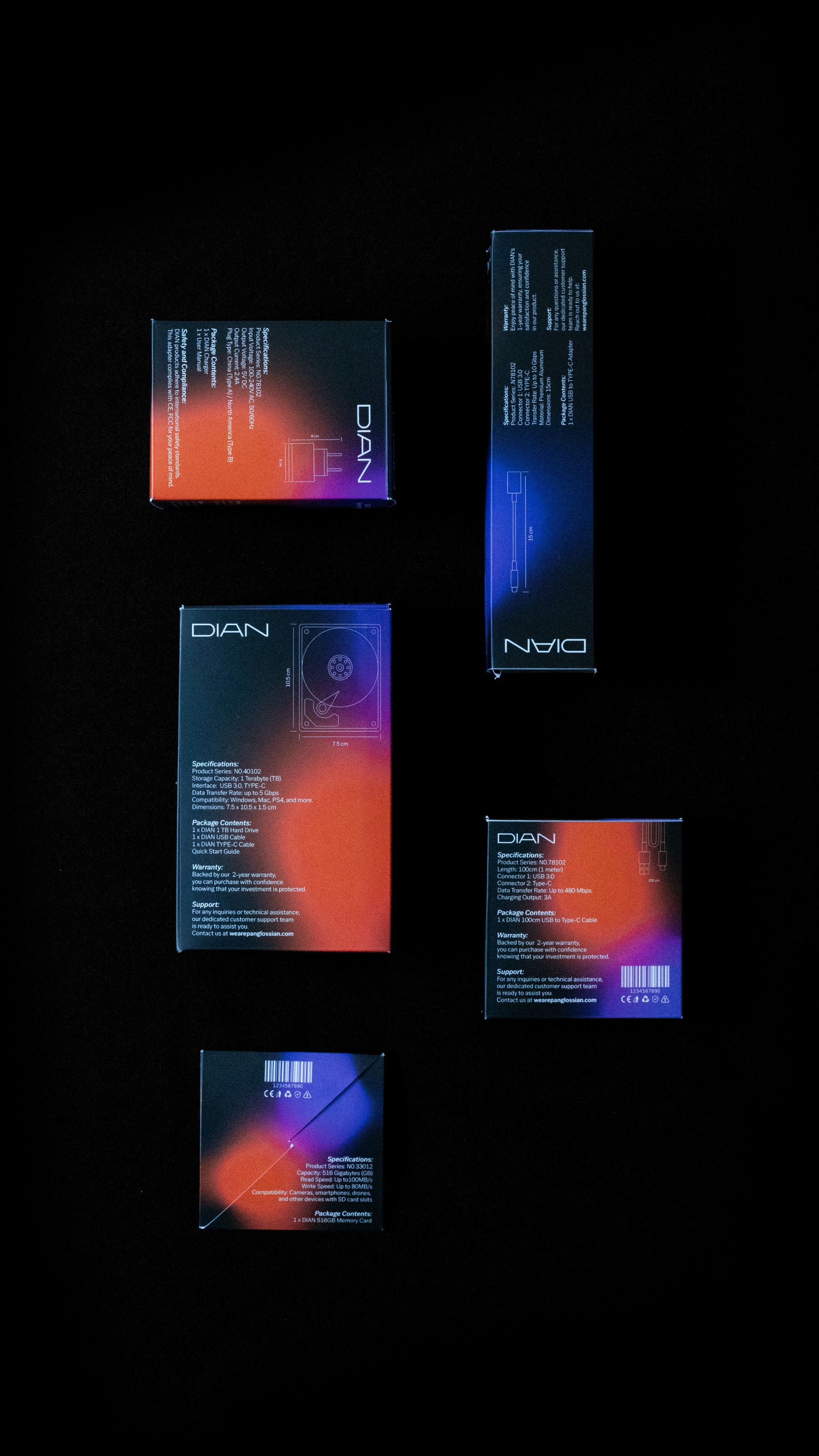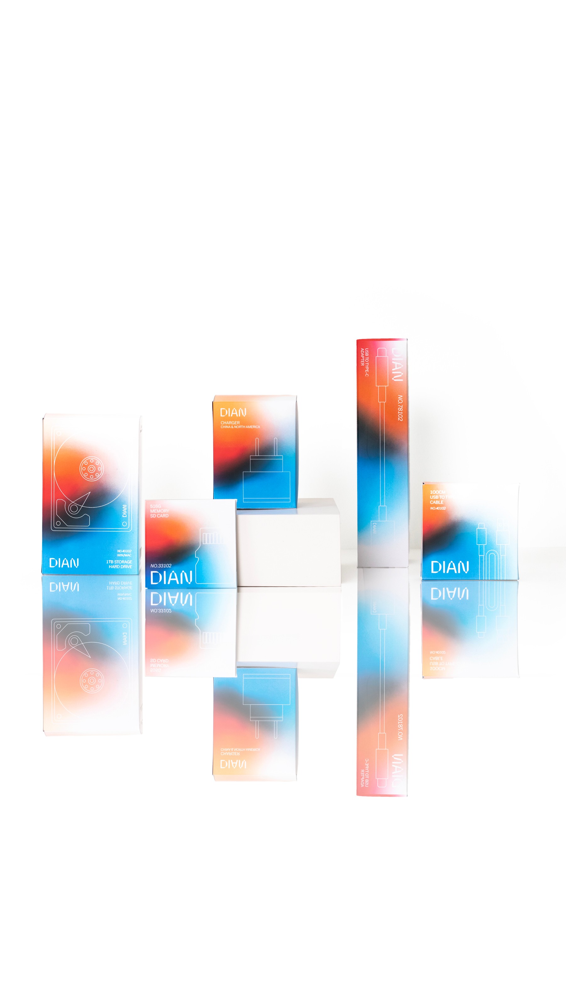 DIAN, a Shenzhen-based electronics accessory brand, aimed to capture the attention of the U.S. market. Panglossian Studio developed a bespoke packaging system, dominated by black tones and accented with purple-to-orange gradients, inspired by the vibrant night lights of New York’s Fifth Avenue.