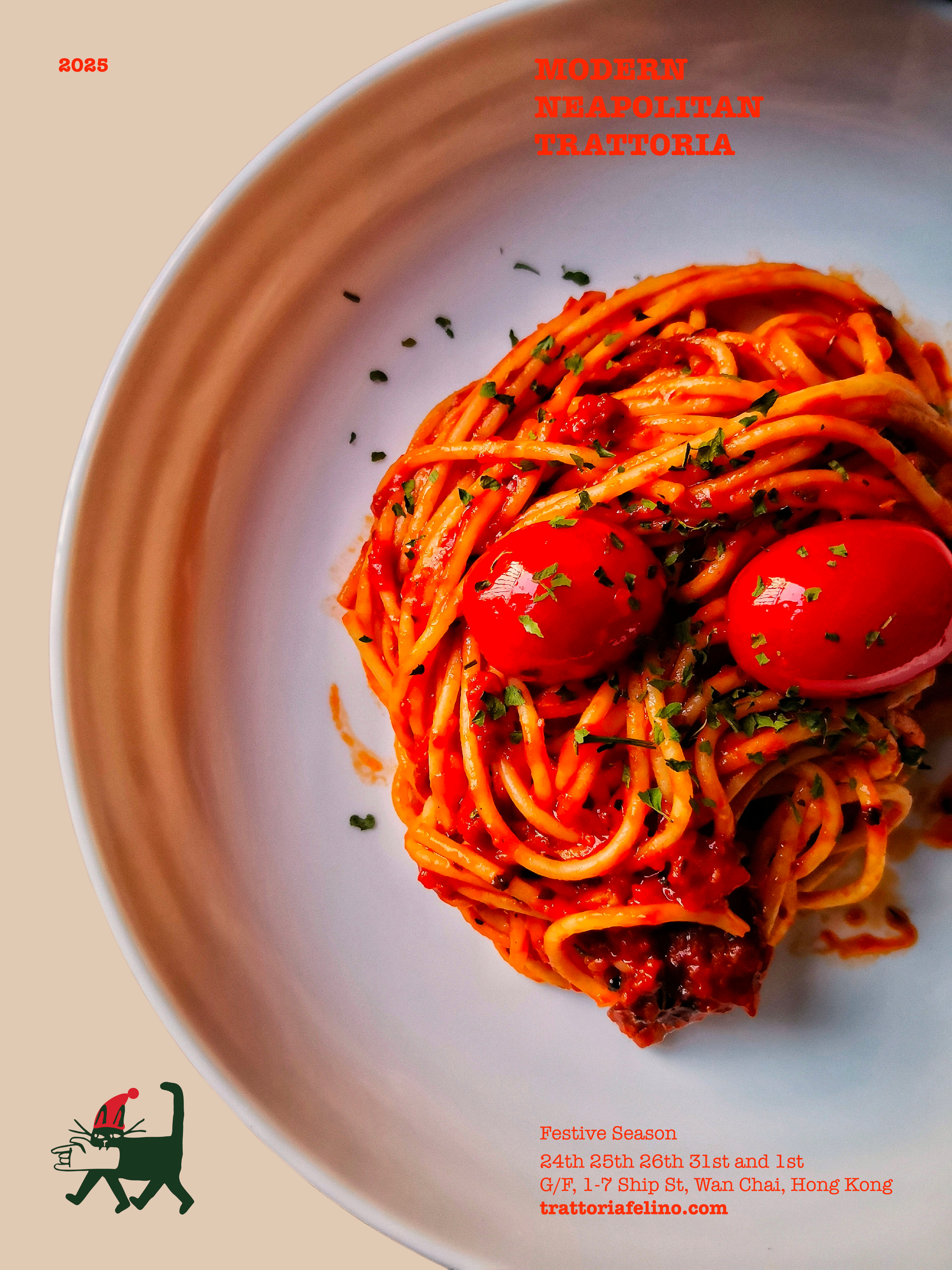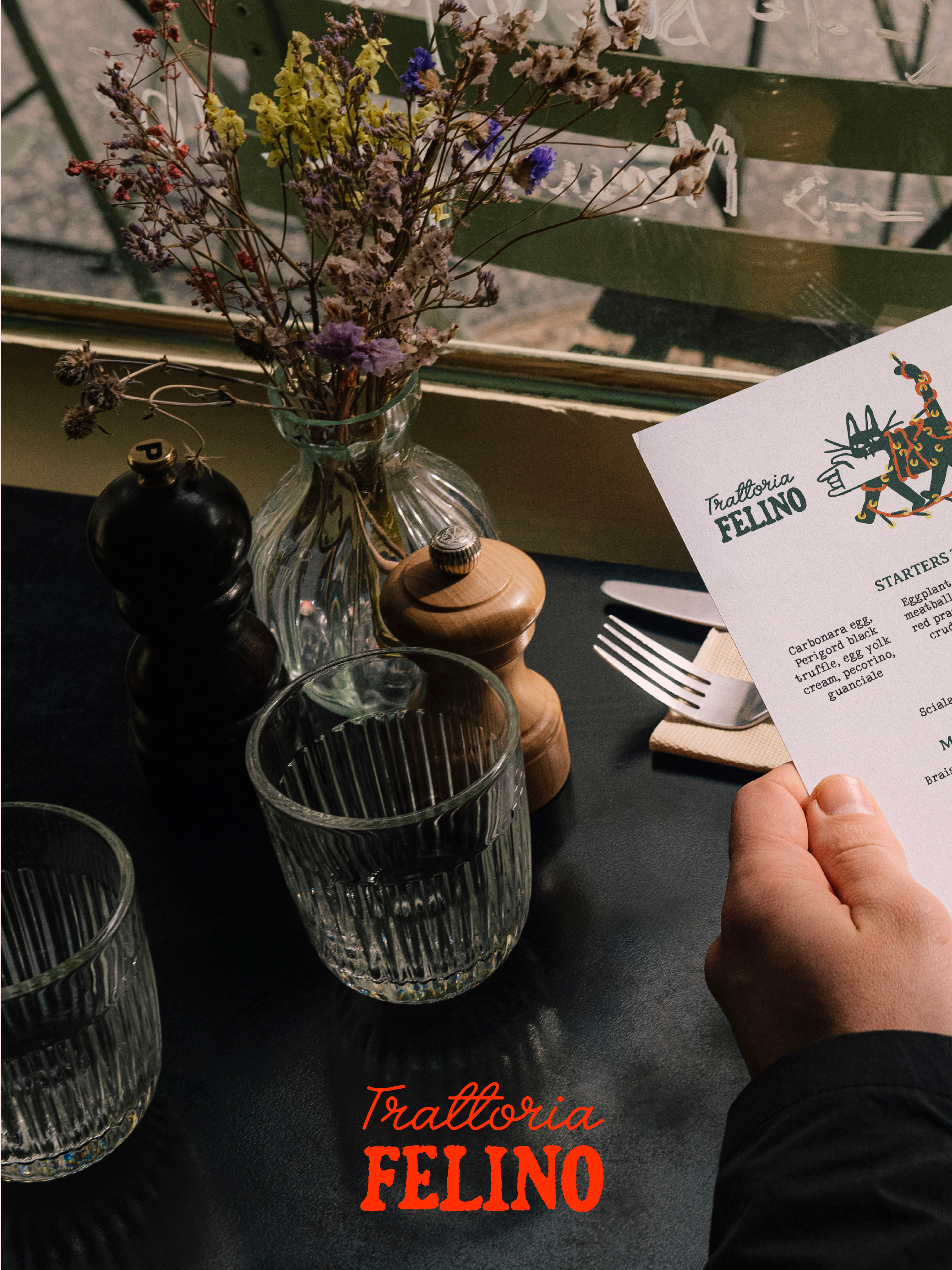 Trattoria Felino is a modern Italian restaurant in Wan Chai, Hong Kong, inspired by the rich culture and folklore of Naples. The brand’s core symbol is a street cat holding the iconic Neapolitan hand gesture, believed to ward off evil. The logo and typography blend tradition with modernity, creating a warm and approachable atmosphere.